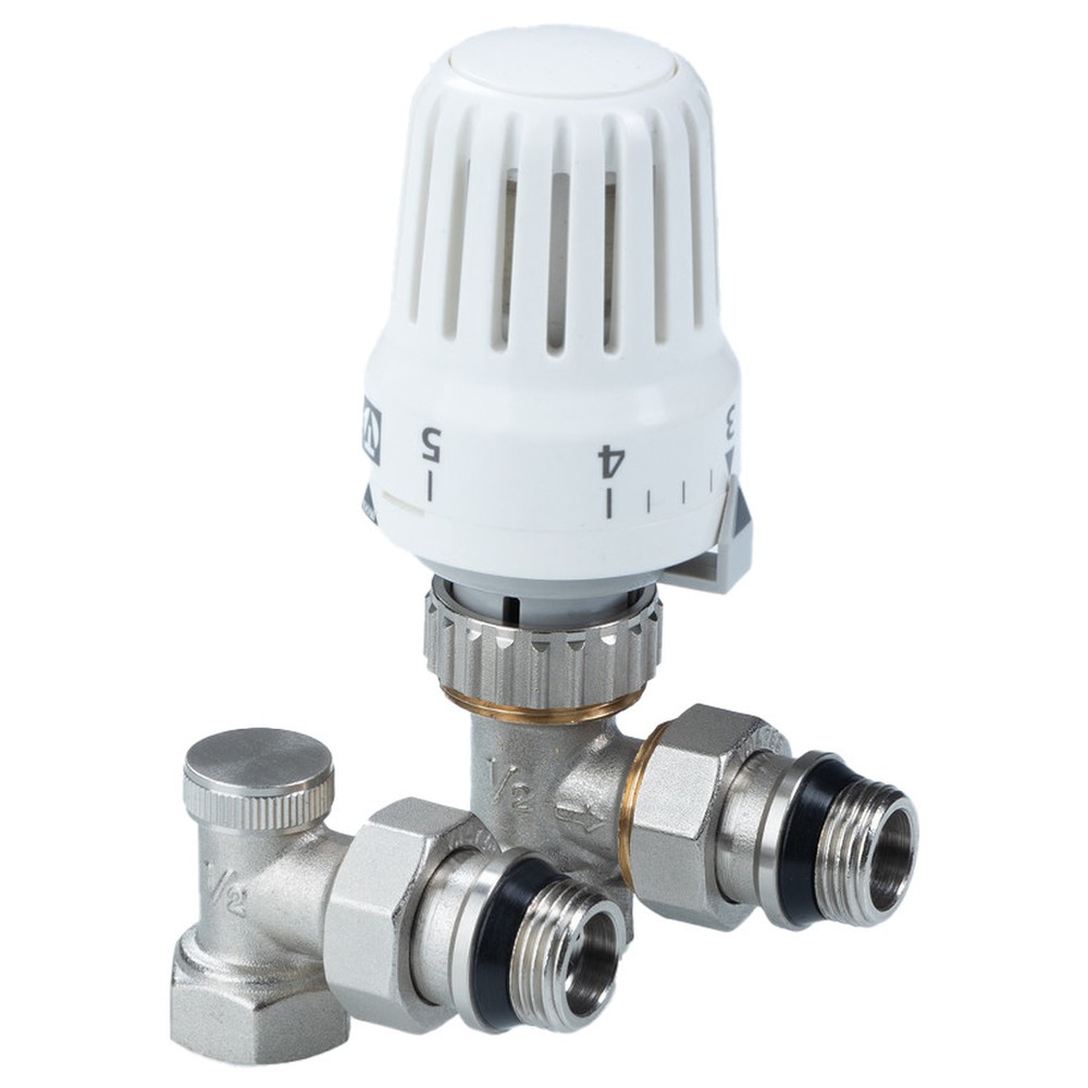 (VT.045.N) Комплект терморегулирующего оборудования VT.045 включает в себя угловые термостатический и запорно-регулировочный (настроечный) радиаторные клапаны и термостатическую головку. Набор предназначен для бокового подключения прибора водяного отопления, автоматического регулирования расхода теплоносителя через него в зависимости от температуры воздуха в помещении, гидравлической балансировки системы отопления. Клапаны выполнены из качественной сантехнической латуни с гальваническим покрытием и оснащены самоуплотняющимися полусгонами. Колпачок ручной регулировки на термостатическом клапане состоит из двух частей – неподвижной нижней и вращающейся верхней. Это позволяет многократно производить монтажную настройку клапана в условиях строительства (до установки термостатической головки), не переживая за целостность резьбы на пластиковом колпачке. Комплект помещен в пылевлагозащитную упаковку (блистер). Стоимость данного комплекта меньше, чем при раздельной покупке входящих в него элементов.