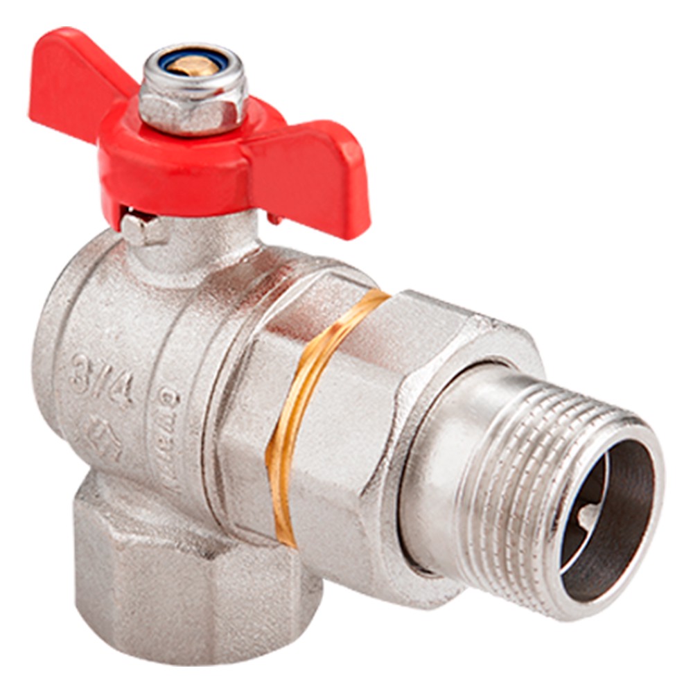 Угловой шаровой кран MVI с полусгоном 1" (внутренняя резьба - наружная резьба), оснащенный рукояткой типа "бабочка" (модель BV.522.06), используется для перекрытия потока в трубопроводных системах, предназначенных для питьевой и технической воды, горячего водоснабжения, отопления, сжатого воздуха и жидких углеводородов.