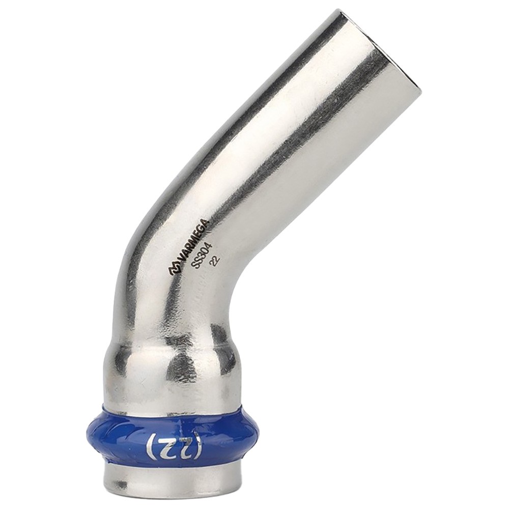 Угольник 45° однораструбный Varmega Inox Press используется для соединения труб и фитингов равных диаметров под углом 45 градусов. Для получения надежного неразъемного соединения трубы и фитинга потребуется специальный пресс-инструмент с насадками типа профиль «V».